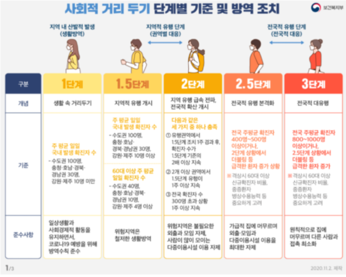 그러다 2020년 11월 1일 정부는 코로나19의 장기화에 따라 지속 가능한 여러 방역체계가 이뤄져야 한다는 판단에 따라서 3단계에서 5단계( 1.5단계, 2.5단계 신설)로 세분화하는 내용의 사회적 거리 두기 개편안을 발표했으며, 이는 11월 7일부터 시행되고 있습니다.