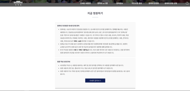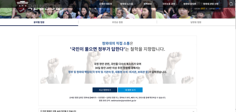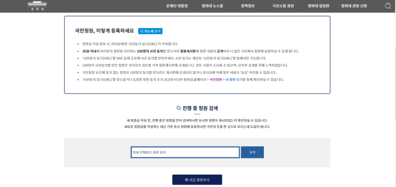 국민과 정부가 소통할 수 있는 공간으로 많이 이용되는 청와대 국민청원 홈페이지는