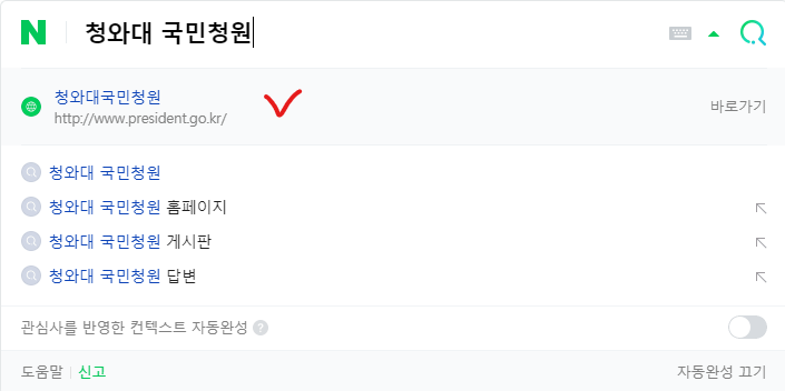 포털사이트에 '청와대 국민청원' 검색 후 접속하시고 네이버의 경우 검색 후 아래의 바로 가기를 클릭하시면 됩니다.