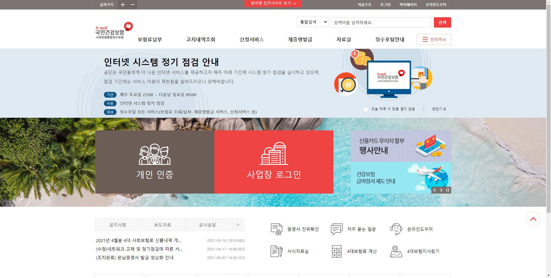 위 링크를 클릭하시면 국민건강보험사회보험통합징수포털 사이트에 접속됩니다.
