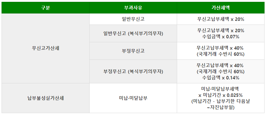 만약 종합소득세를 신고 및 납부하지 않을 시 어떠한 불이익을 얻게될까요, 우선은 각종 세액공제 및 감면을 받을 수 없게 되는데요, 이외에도 무거운 가산세를 부담하게 됩니다, 여기서 발생하게 되는 가산세는 무신고가산제와 납부불성실가산세로 이루어져 있으며 무신고가산세와 무기장가산세가 동시에 적용이 되면 가장 큰 가산세액이 적용되므로 이점 유의하셔야 할겁니다, 아래는 무신고가산세와 납부불성실가산세에 대한 자료입니다,