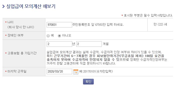 확인을 눌러주시면 본인의 만 연령이 나타나게 되며 바로 밑에 칸에는 퇴사하기 직전의 3개월 동안 자신이 받아왔던 월 급여액을 입력해주시면 됩니다, 급여액은 세금을 제하기 전 금액으로 입력을 하셔야 하며 기본급과 수당을 포함한 총 급여액을 입력해주시면 됩니다,