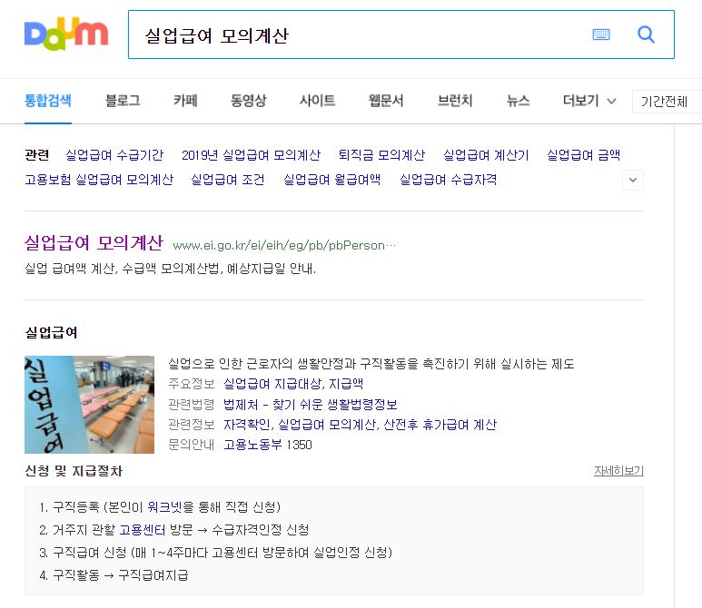 모의계산 서비스를 이용하기 위해서는 '다음' 에서는 실업급여 모의계산, '네이버' 에서는 고용보험 이라고 검색을 하시면 쉽게 고용보험 홈페이지에 들어가실 수 있습니다,